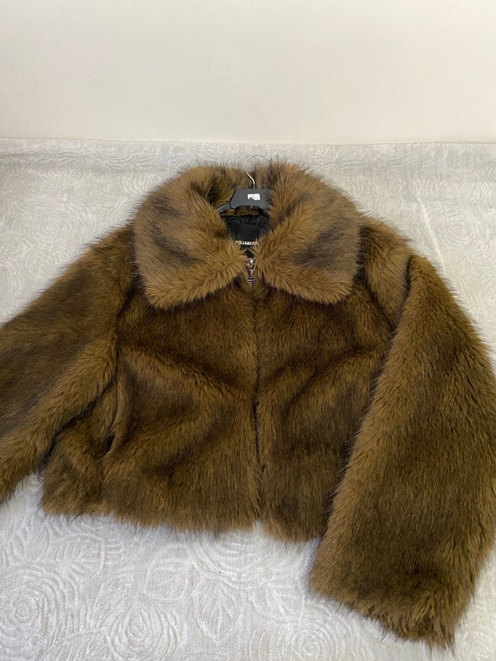 Kahverengi kürk detaylı, notched lapel yakalı, uzun kollu, bol kesim midi uzunlukta kadın mont. Hiçbir deformesi yok. Geçen sezonun viral kürkü