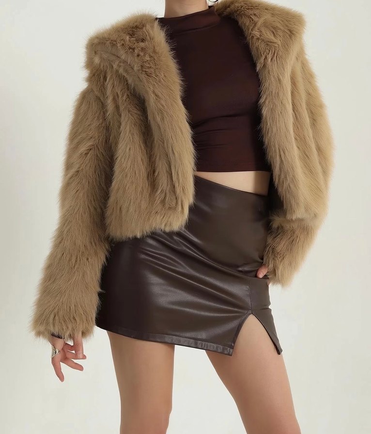 Kahverengi deri mini etek, yırtmaçlı ve kürk detaylı kısa peluş ceketle kombinlenmiştir. Günlük rahat sokak stili için uygundur. ✨