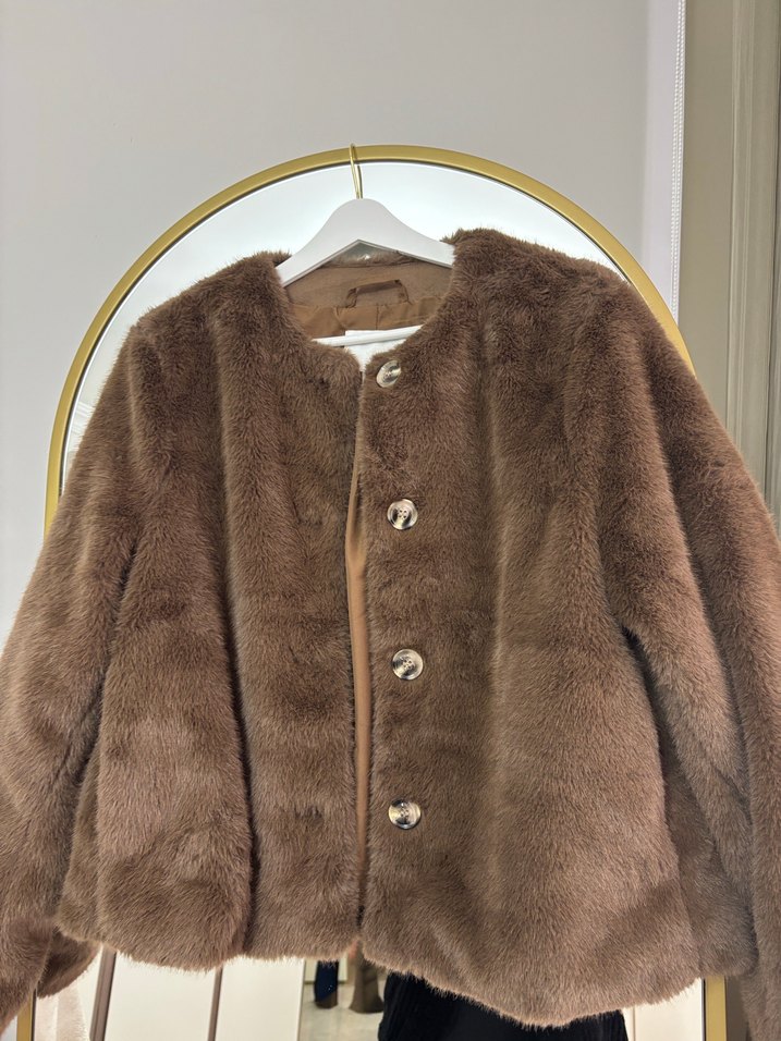 Ürün bir kere giyildi Kahverengi parlak süet görünümlü, kürk detaylı, uzun kollu, notlu yakalı, bol kesim midi kadın mont. Günlük kullanım için uygundur.