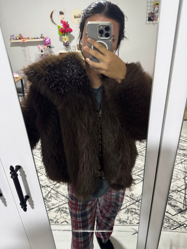 Kahverengi yün, kürk detaylı, midi uzunlukta ve uzun kollu bol kesim ceket. Askısız yakalı, desen içermeyen rahat tasarım, günlük kullanım için uygun.