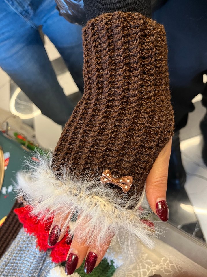 Kahverengi örgü kadın eldiveni, kürk detayları ve küçük bir fiyonk ile sıcak ve bohem bir tarz sunar.