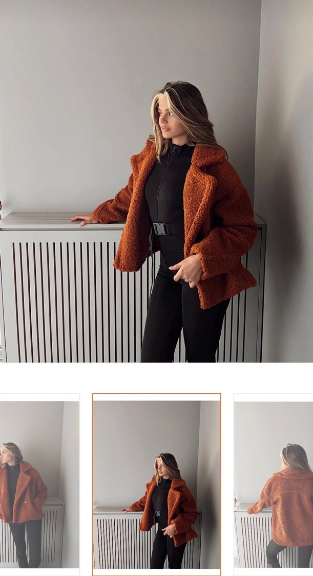 Kahverengi kiremit rengi arasında, uzun kollu, yüksek yakalı, kürk detaylı, midi uzunlukta, rahat kesimli kadın ceket.