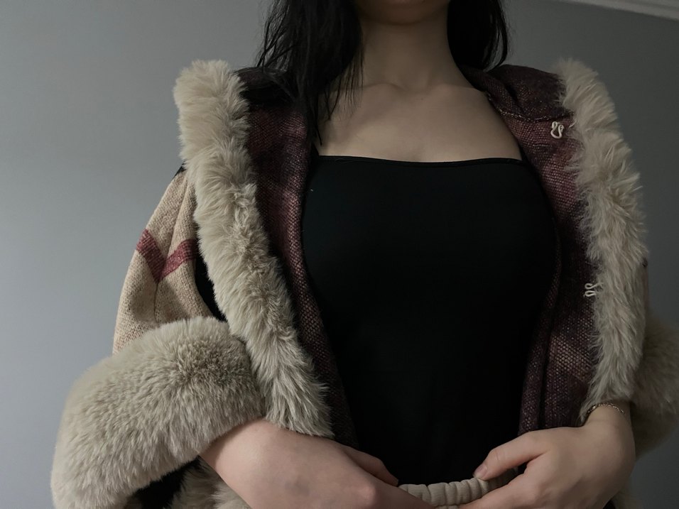 Kahverengi sentetik kumaştan, kürk detaylı straplez ve fitted kesim midi elbisedir. Goth tarzda, askılı kolları vardır, günlük kullanıma uygundur.