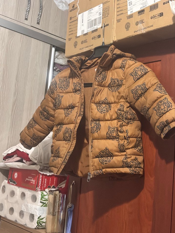 Kahverengi baskılı, kürklü detaylı, yumuşak ve sıcak fleece kumaştan yapılmış, erkek çocuklar için dar kesim mont. Notched lapel yakaya sahiptir.