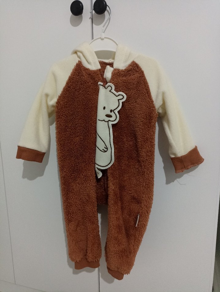Kahverengi, yumuşak ve sıcak kumaştan bebek erkek tulumu, kürklü detaylar ve sevimli ayı desenine sahip. hediye geldiği için kullanmadık çok küçük oldu