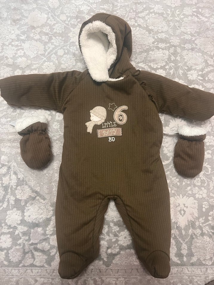 Koyu kahverengi, yumuşak ve sıcak kumaşlı bebek tulumu, kürklü kapüşon ve eldivenlerle, nakış detaylı rahat kesim. ❄️ 2-3 kez giyildi tertemiz