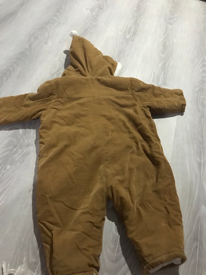 Kahverengi, yumuşak ve sıcak kumaştan, kürklü detaylı, sokak tarzı bebek kayak tulumu. ❄️