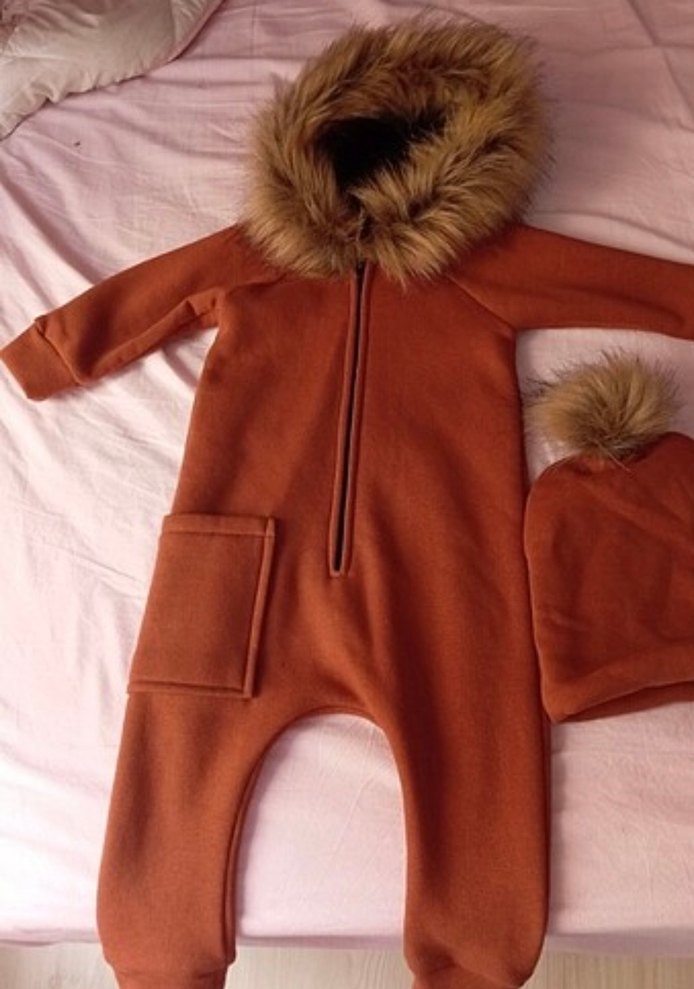 Koyu kahverengi, yumuşak ve sıcak kumaştan yapılmış bebek kayak tulumu, kürklü kapüşon ve uyumlu şapka ile. Sokak stili ve büyük ön cepli. ❄️