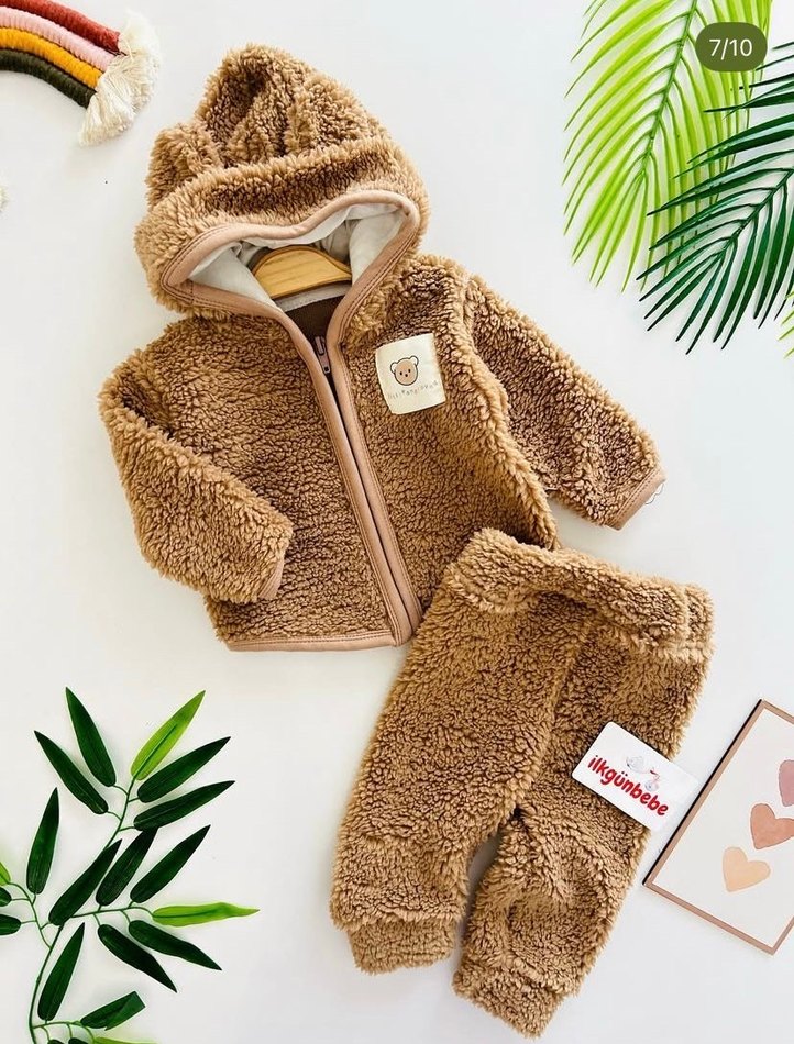Yumuşak ve sıcak kumaştan yapılmış, kürk detaylı kahverengi bebek tulumu. Kapüşonlu ceket ve uyumlu pantolon içerir. 0-3 3-6 6-9 9-12 ay mecvut