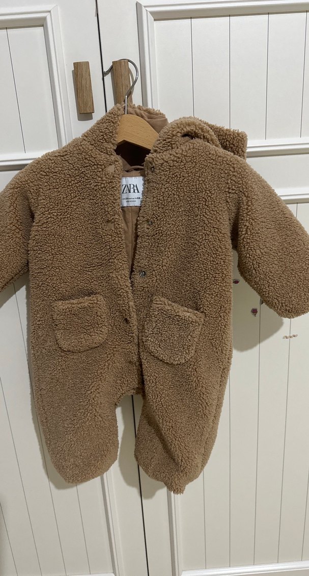 Kahverengi, yumuşak ve sıcak kumaştan yapılmış, kürk detaylı bebek tulumu. Kapüşonlu ve ön ceplidir, sade streetwear tarzında.