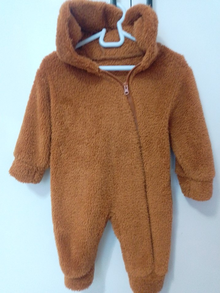 Kahverengi, kürklü detaylı bebek tulumu yenidogan dan itibaren giydirdim ben 6 ay a kadar temizdir kusursuz .