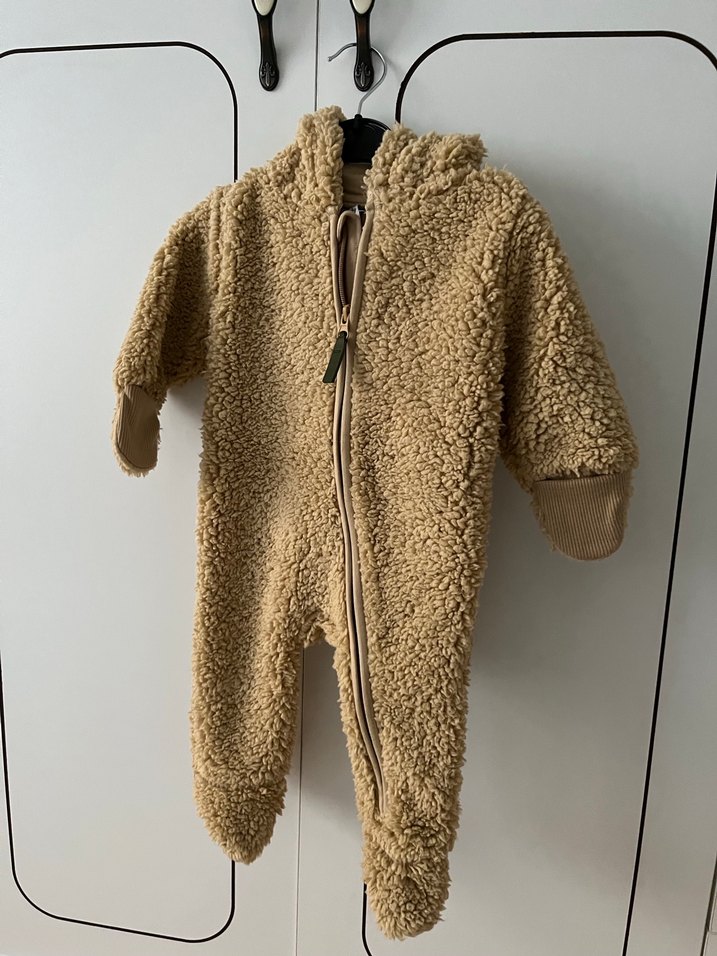Kahverengi, kürk detaylı yumuşak kumaştan yapılmış, ön fermuarlı ve ribanalı manşetlere sahip bebek tulumu, sıcaklık ve konfor sağlar. ❄️