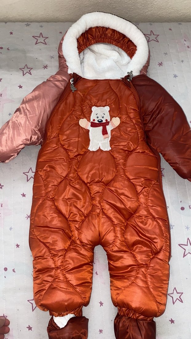Kahverengi bebek tulumu, kürklü detaylı ve yakası notched lapel kesimlidir. Önünde sevimli bir ayı figürü bulunur. ❄️