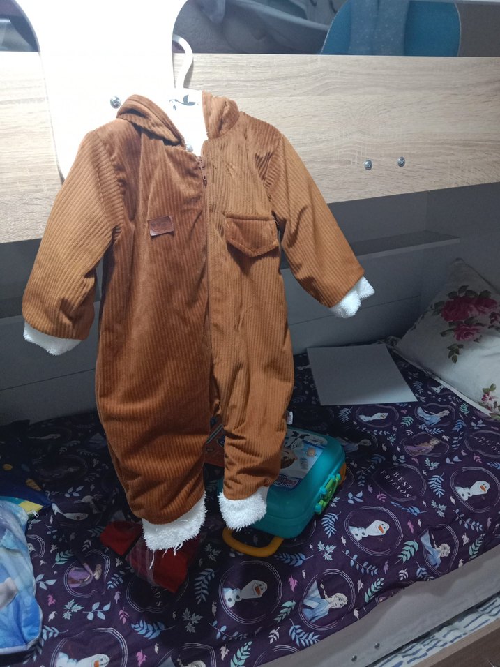 Kahverengi, yumuşak ve sıcak kumaştan yapılmış, kapüşon ve manşetlerde kürk detaylı, sade sokak stili bebek tulumu. ❄️