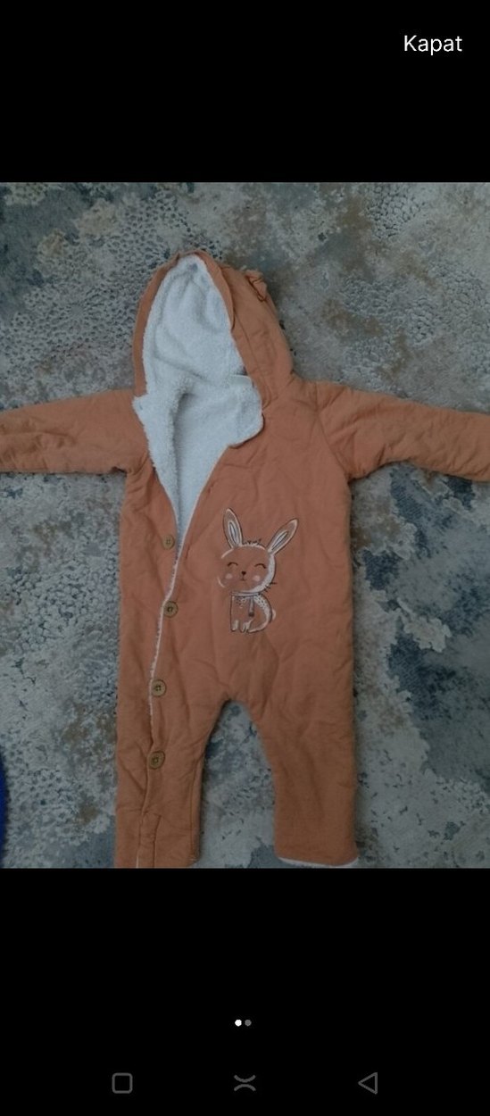 Yumuşak ve sıcak kumaşlı, içi kürklü bebek tulumu. Önünde işlemeli tavşan deseni ve kapüşon bulunur. Pastel kahverengi renkli, rahat sokak stili tulum.