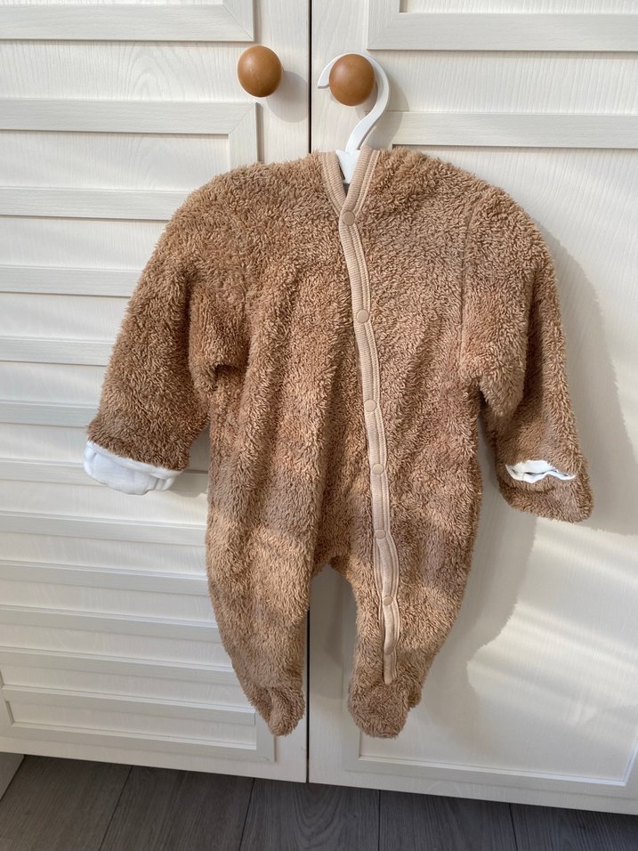 Kahverengi, kürklü dokulu, kesik yaka detaylı, desensiz bebek tulumu. Sıcak ve rahat bir yapıya sahiptir.
