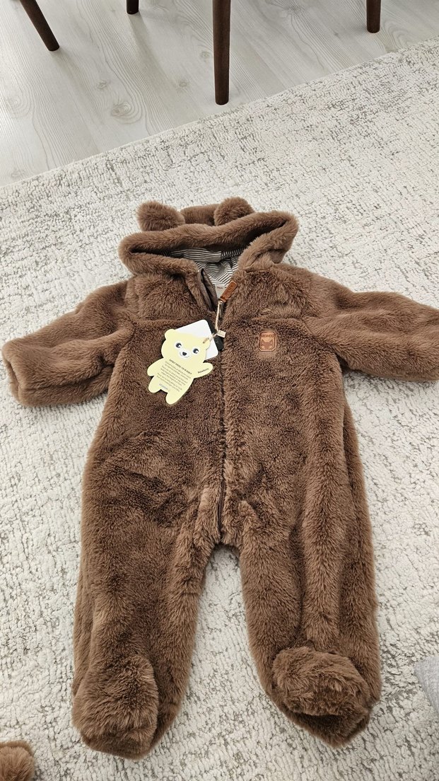 Kahverengi, kürklü detaylı, kapüşonlu ve fermuarlı bebek tulumu, yumuşak ve sıcak tutan kumaştan yapılmıştır. güncel fiyatı sonda eklidir