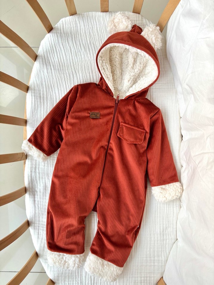Kahverengi bebek tulumu, kapüşon ve manşetlerde yumuşak kürk detaylı, sıcak kumaştan üretilmiştir. Önde fermuar ve küçük cep bulunur. 6-9 9-12 12-18 18-24 ay mevcut