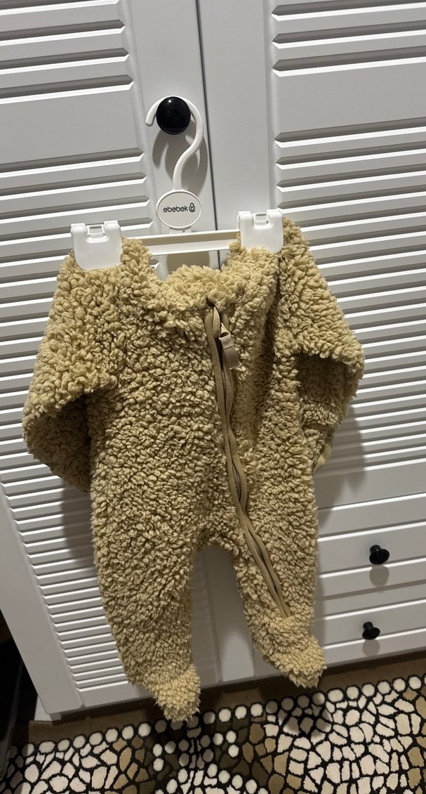 Yumuşak, kahverengi kürk detaylı kumaştan yapılmış bebek tulumu. Sade, desensiz tasarımı ve ön fermuarı ile sıcak tutar.