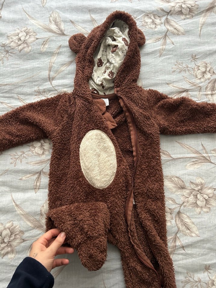 Yumuşak ve sıcak kumaştan kahverengi bebek tulumu, kürk detaylı. Kapüşonunda sevimli kulaklar ve önünde açık renk oval bir detay bulunur.