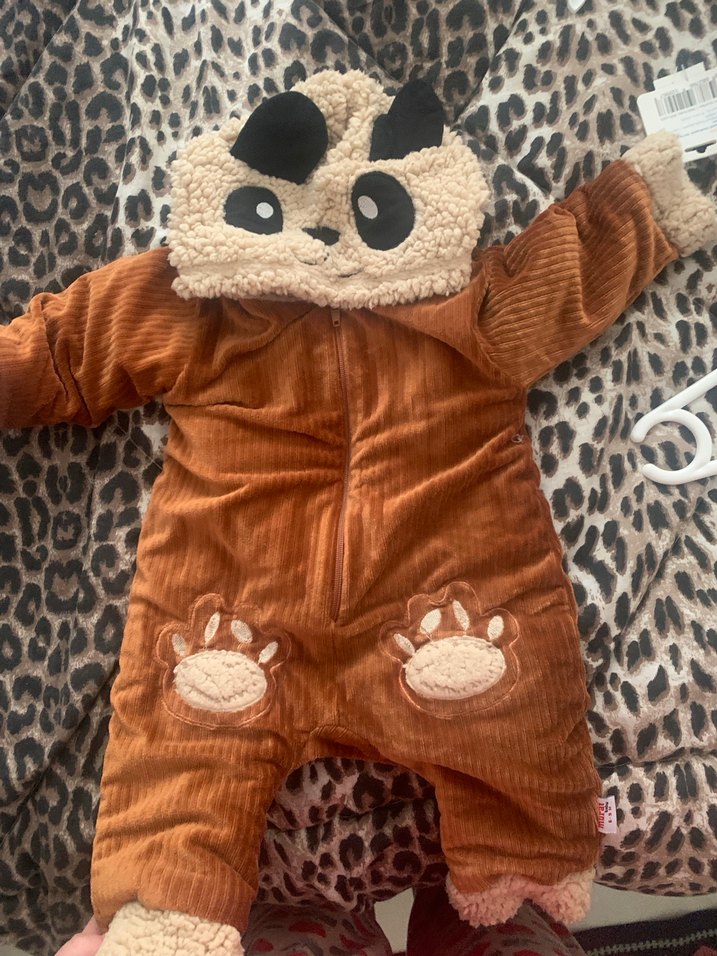 Kahverengi, yumuşak ve sıcak kumaştan yapılmış, kürklü detaylara ve kapüşonda sevimli hayvan yüzüne sahip sokak stili bebek tulumu.