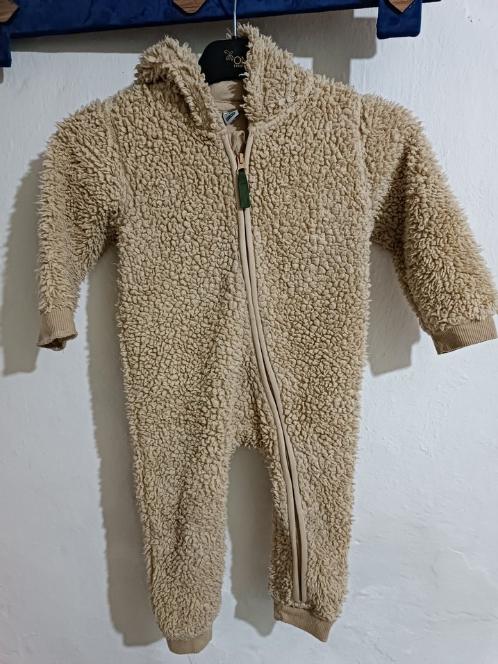 Kahverengi, kürklü detaylı, kapüşonlu ve ön fermuarlı bebek tulumu, yumuşak ve sıcak tutan kumaştan yapılmıştır.