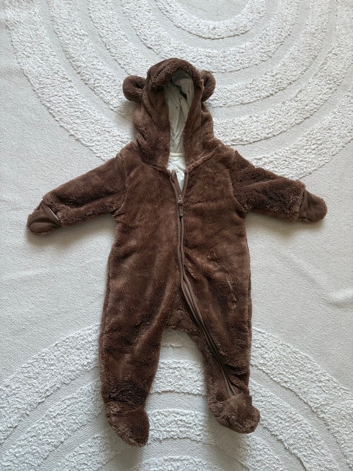 Kahverengi, yumuşak ve sıcak kumaştan yapılmış, kulaklı kapüşon ve tam ön fermuarlı, kürklü detaylı bebek tulumu.