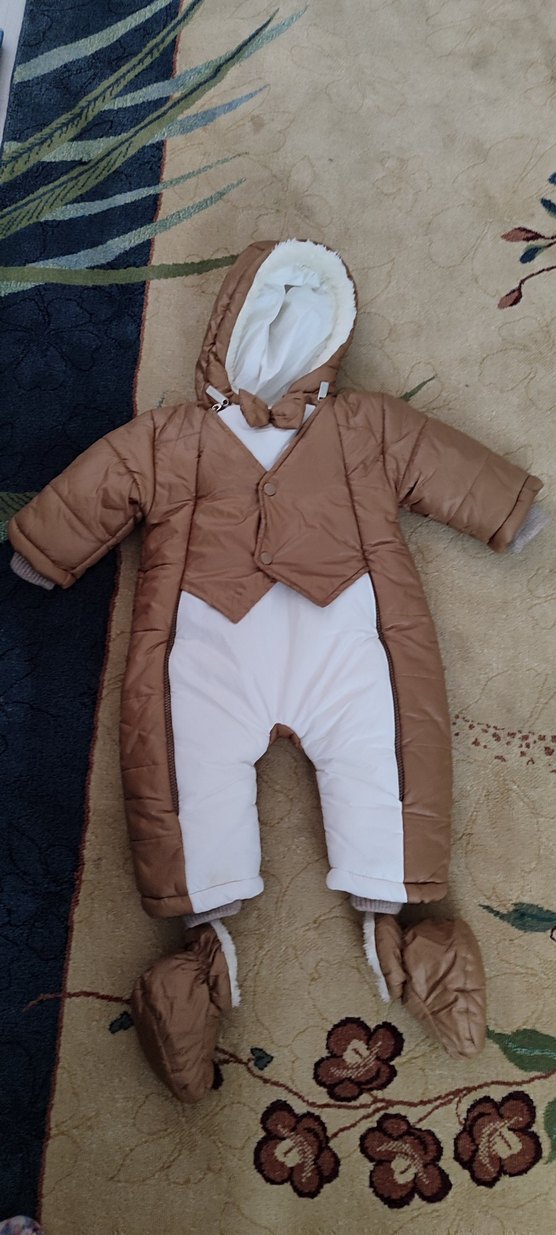 Kahverengi ve kürklü detaylara sahip, yaka kısmı kesimli bebek tulumu. Yumuşak astarı ve desensiz tasarımıyla sıcak tutar. ❄️