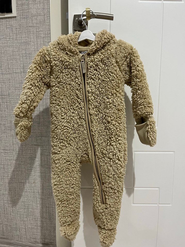 Yumuşak, kürklü kumaştan yapılmış, kapüşonlu kahverengi bebek tulumu hiç giyilmedi bebeğime beden olarak uymadığı için satıyorum