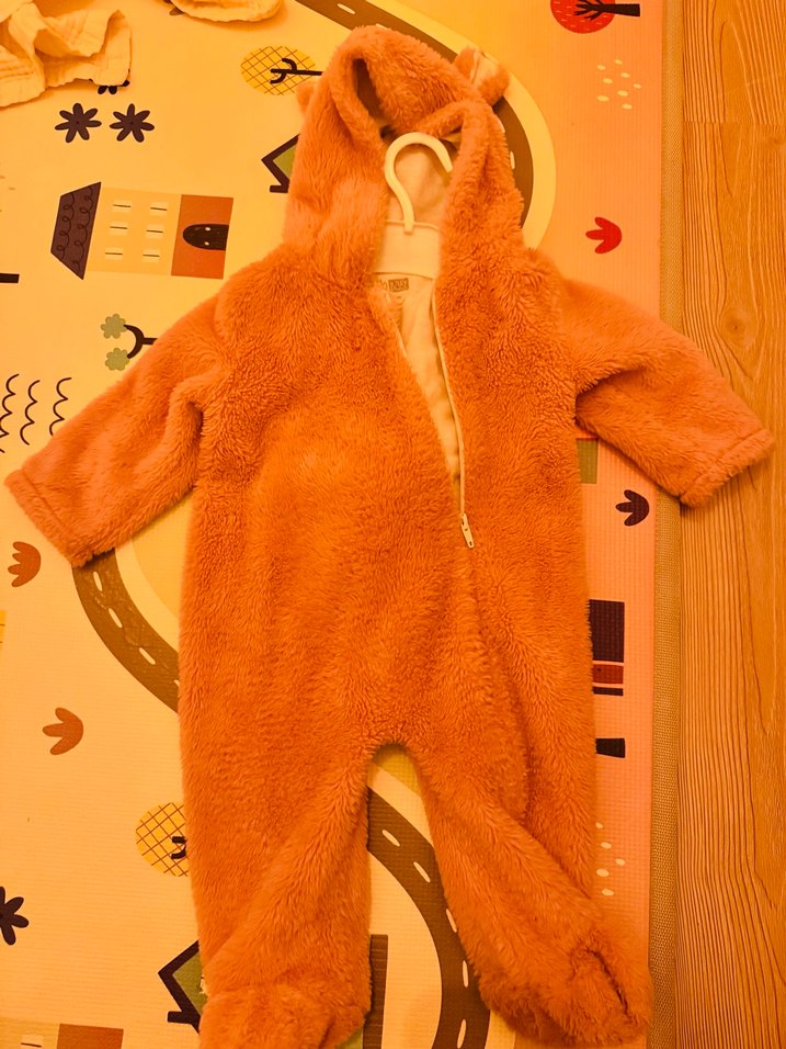 kürklü detaylı, kapüşonlu ve yumuşak dokulu bebek tulumu. Sokak stili için uygun, desensiz ve renkli bir tasarıma sahiptir.