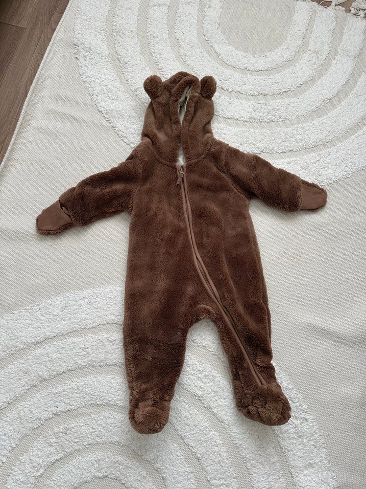 Kahverengi, yumuşak ve sıcak kumaştan yapılmış, kulaklı kapüşon ve kürk detaylı bebek tulumu. Önden fermuarlı.
