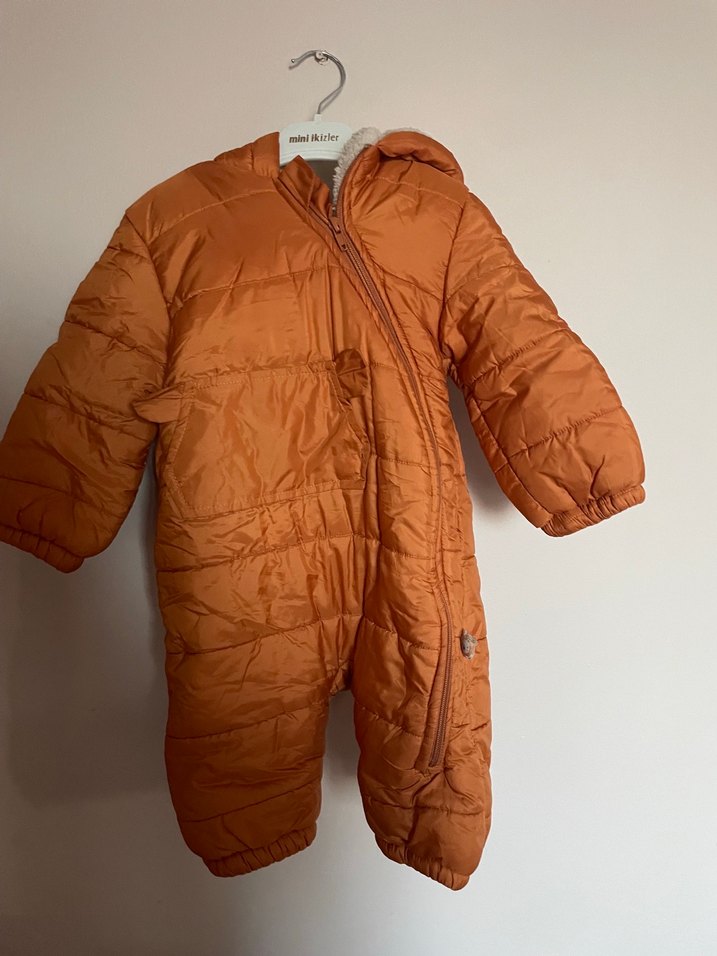 Parlak kahverengi, kürklü detaylı ve yakalı bebek tulumu, bebeğinizi sıcak tutar. ❄️mont kumaşındandır