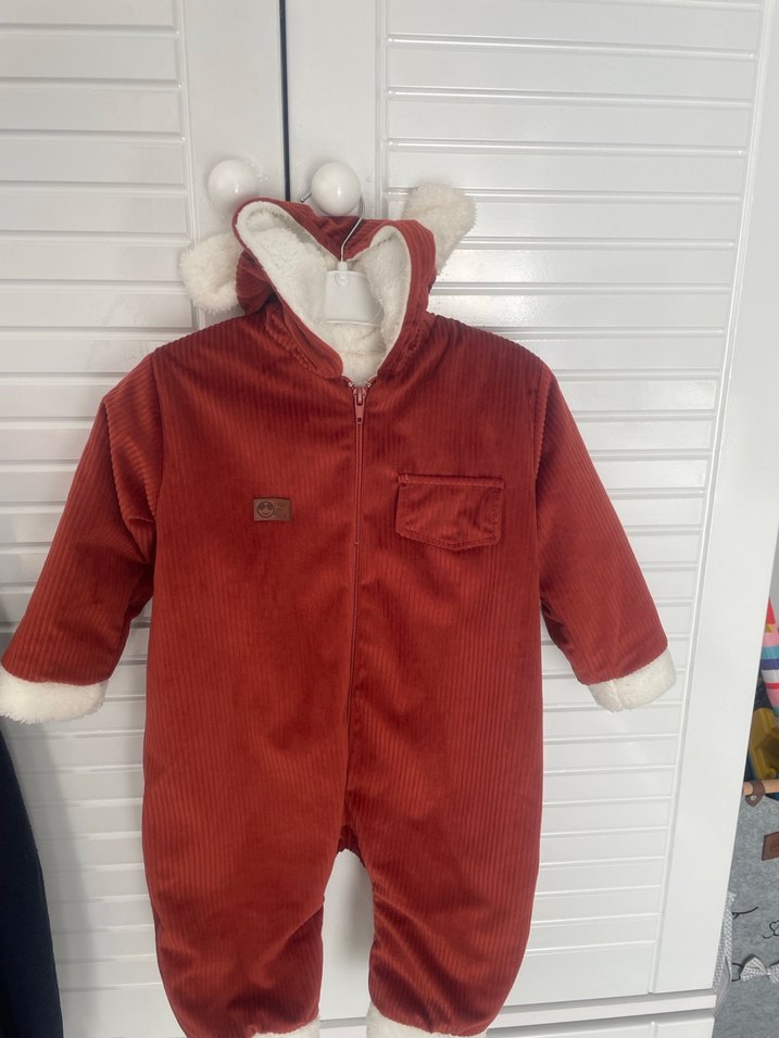 Kahverengi, yumuşak ve sıcak kumaşlı bebek tulumu, kapüşonunda kürk detaylıdır. Önünde fermuar ve göğüs cebine sahiptir.