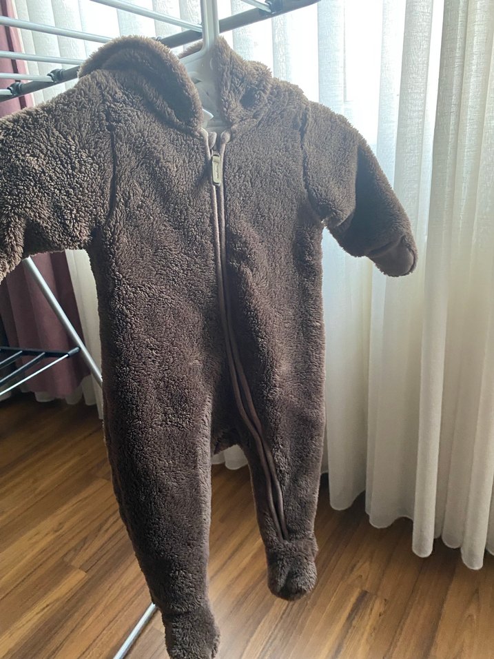 Yumuşak kumaşlı koyu kahverengi bebek tulumu, kapüşonlu ve ön fermuarlı, kürk detaylıdır. Yanındaki çıtçıtlı disney tulum hediye