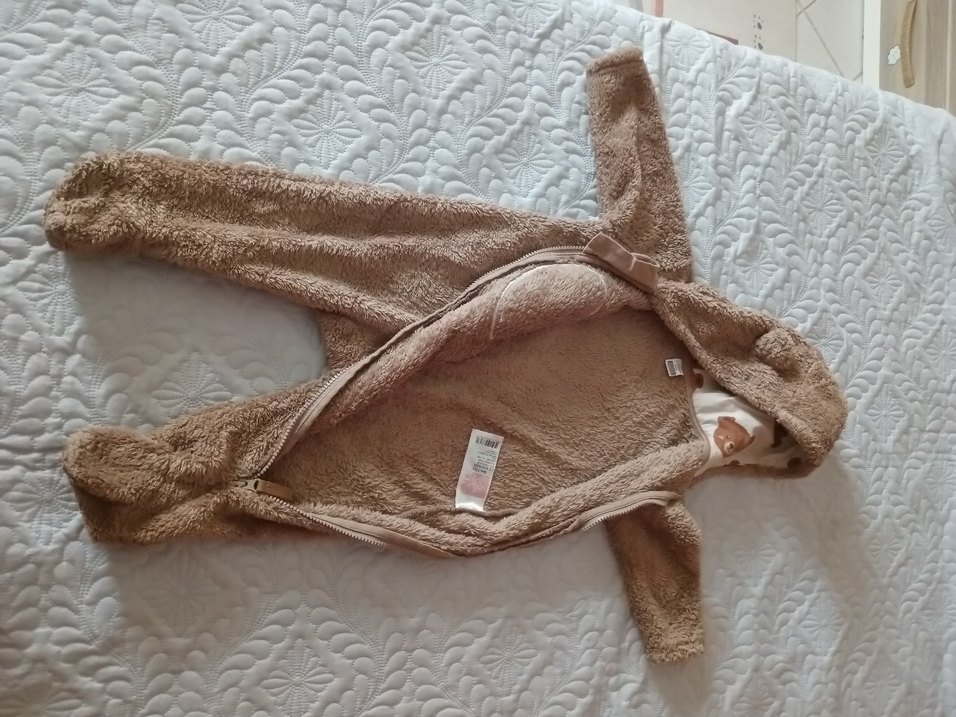 Yumuşak ve sıcak kumaştan kahverengi bebek tulumu, kürk detaylı ve gri aksanlı, kolay giyilmesi için fermuarlı.