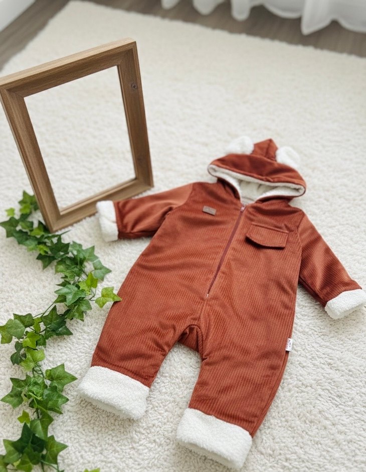 6-9 9-12 12-18 ay Kahverengi, kürklü detaylı, fermuarlı bebek tulumu. Yumuşak ve sıcak kumaştan, sokak stili görünümünde.