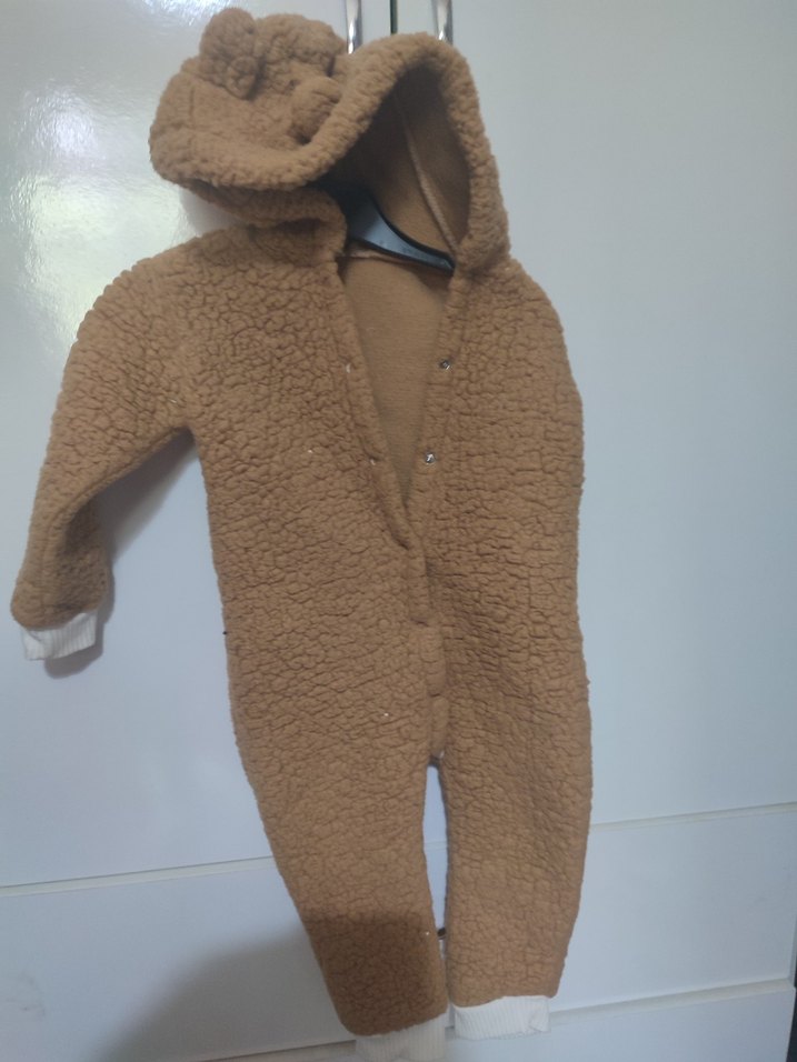 Yumuşak ve sıcak kumaştan kahverengi bebek tulumu, kürklü kapüşon ve kolay giyimi sağlayan çıtçıt düğmeler içerir. 9 -12 aylık