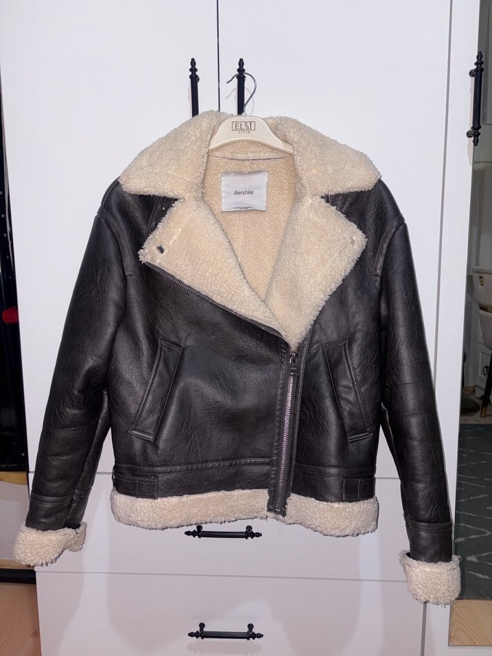 Kahverengi deri biker ceket, kürk detaylı yaka, manşet ve etek ucu ile sıcak tutar. Strappy kollu, normal uzunlukta, baskılı ve günlük kullanıma uygundur.