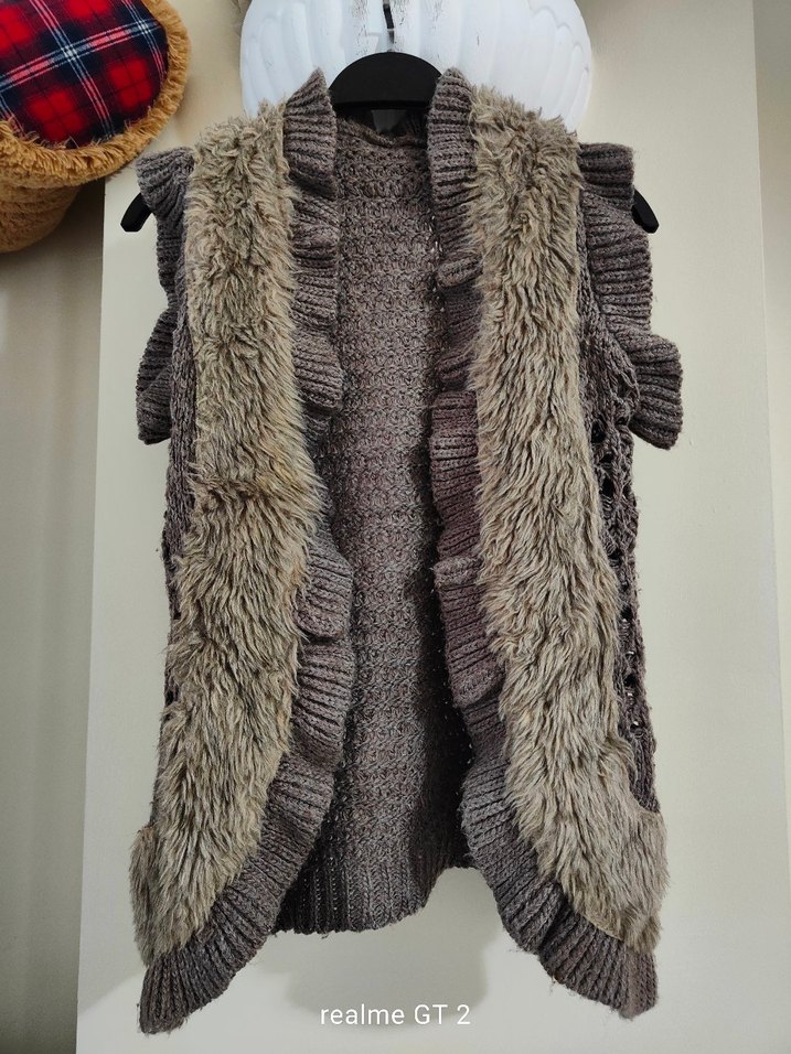 Kahverengi triko, kürklü detaylı, kolsuz yelek