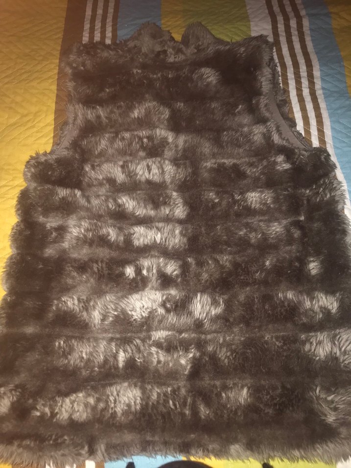 Kahverengi, kürklü ve bohem tarzda, yumuşak sentetik kumaştan yapılmış, kolsuz ve boğazlı kadın yeleği. Günlük kullanıma uygundur.