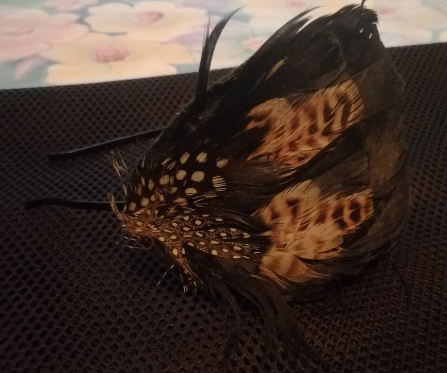Sentetik kumaştan yapılmış, kahverengi, kürklü detaylı bohem tarzı tüylerden oluşan koyu saç aksesuarı.