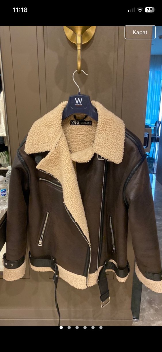 Kahverengi deri biker ceket, kürklü detaylı ve yakalı. Strappy kollu, normal kesim ve fermuarlı ceplidir. Günlük kullanıma uygundur.