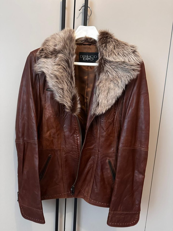 Kahverengi deri, kürk detaylı, yakalı ve uzun kollu, ince kesim biker ceket. Normal boyda, desen içermeyen ve günlük kullanıma uygun. İçinde "DRMS" etiketi bulunur.