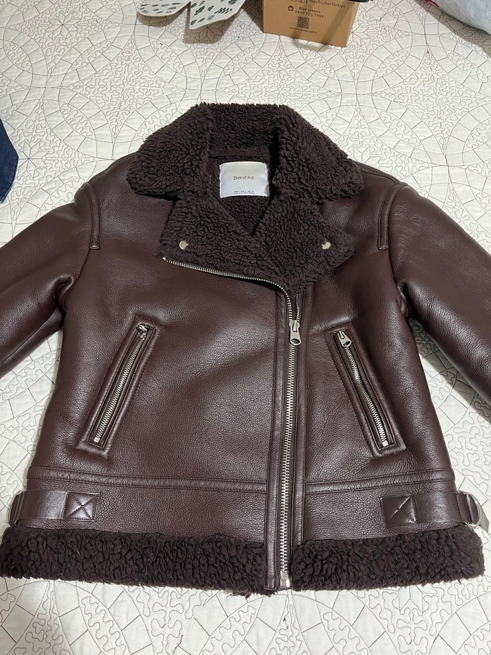 Kahverengi deri biker ceket, kürk detaylı yaka ve etek ucu, keskin yaka ve askılı kollara sahiptir. Günlük kullanıma uygun normal boydadır. S beden
