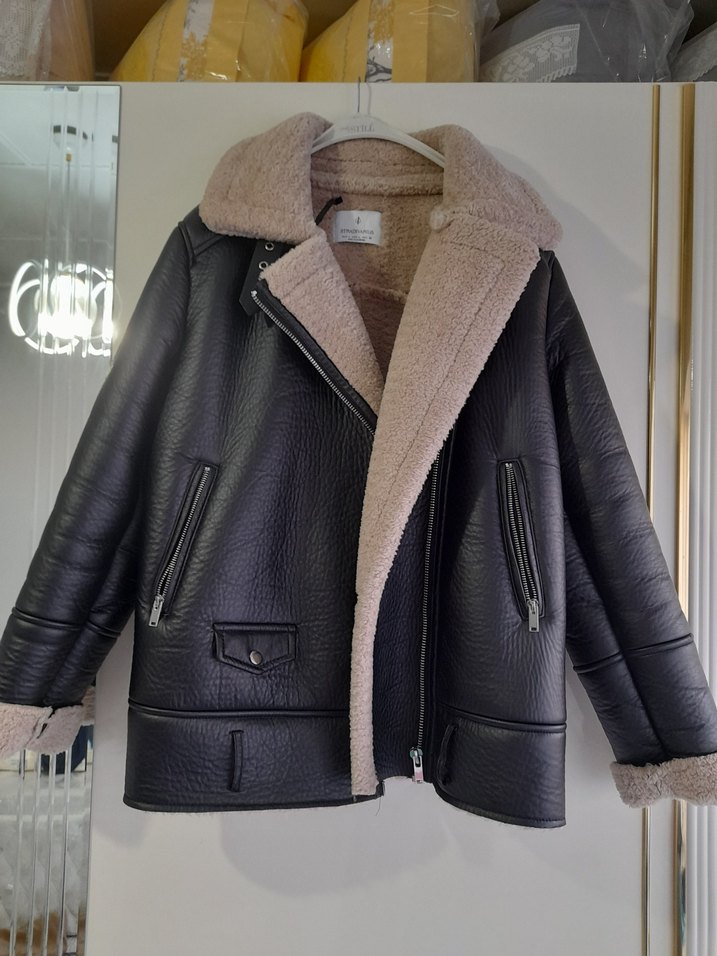 Kahverengi deri biker ceket, kürk detaylı ve kesik yakalı. Normal uzunlukta ve regular fit, günlük kullanım için uygundur.
