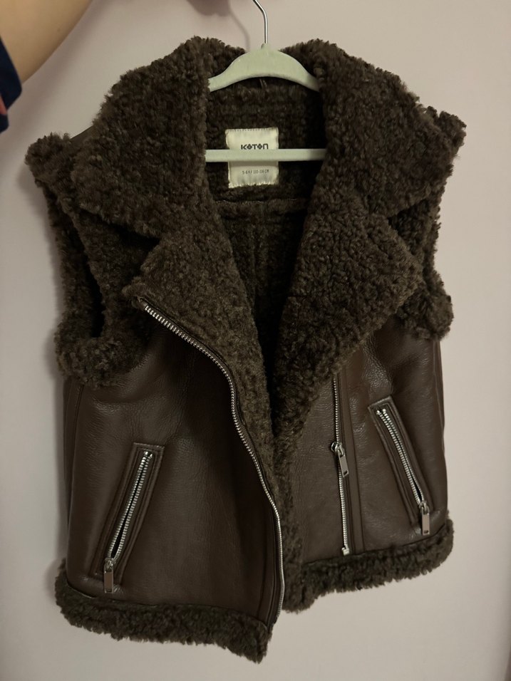 Kahverengi deri ve kürk detaylı, yaka kısmı kesik, kolsuz ve normal midi boyda, fitted kesim biker yelek. İki fermuarlı cep içerir, rahat kullanıma uygundur.
