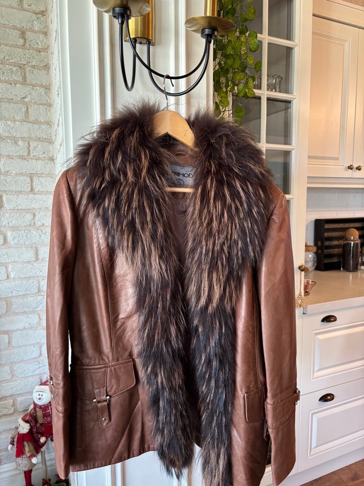 Kahverengi deri, kürklü detaylı, yakası kesik, uzun kollu, goth tarzda, Paris etkili, günlük kullanıma uygun.