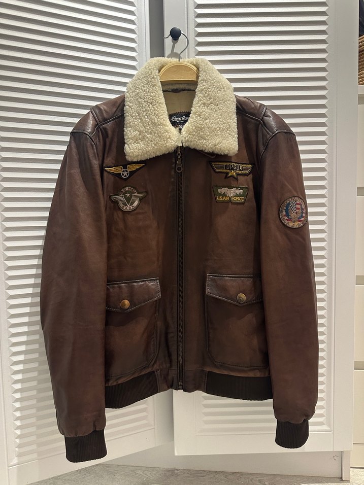 Kahverengi deri ceket, kürklü yaka ve nakışlı detaylarla, çıtçıtlı uzun kollu ve normal kesim olarak tasarlanmıştır. M beden %100 deri