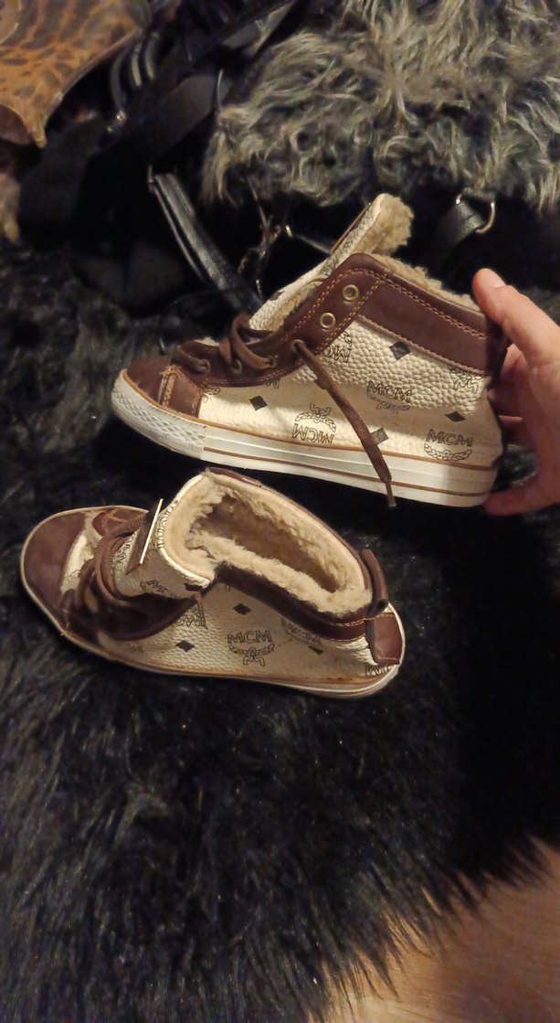 Kahverengi deri, kürklü ve baskılı desenli dolgu topuklu sneakers. Günlük sokak stili için uygun, trend bir görünüm sunar.