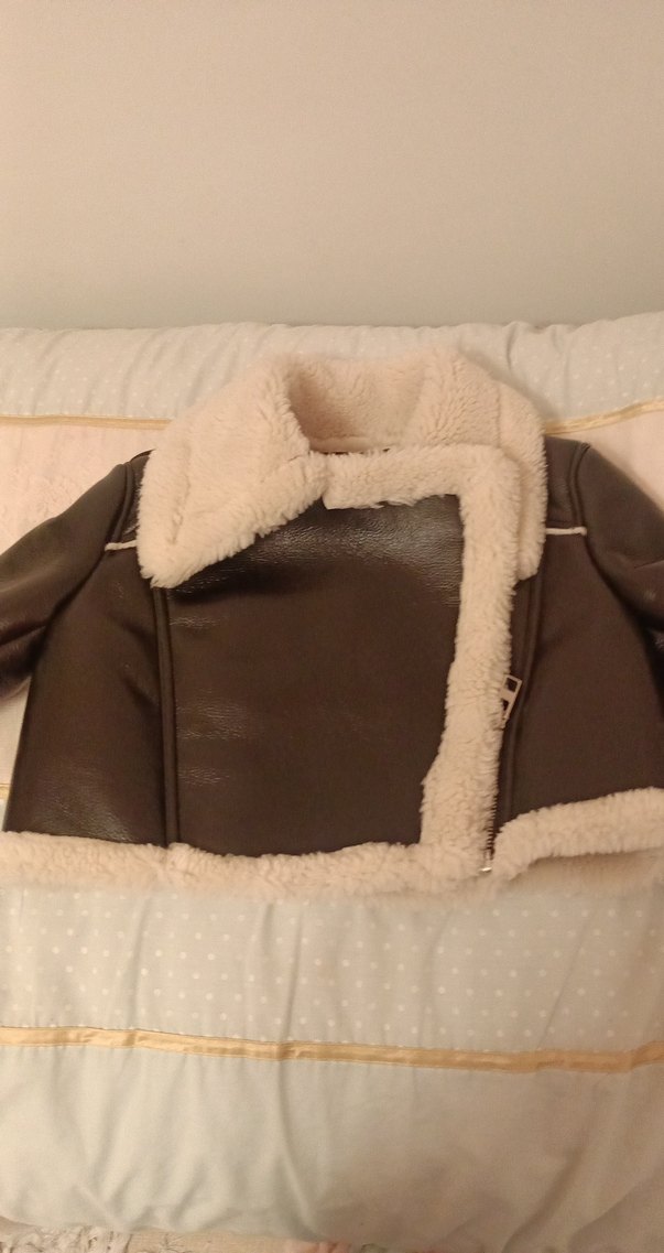Kahverengi deri, kürklü detaylı ve kesimli biker ceket, yakasında kesik yaka ve normal boyda tasarlanmıştır. sıfırdan farksızdır tertemiz hiçbir sorunu yoktur